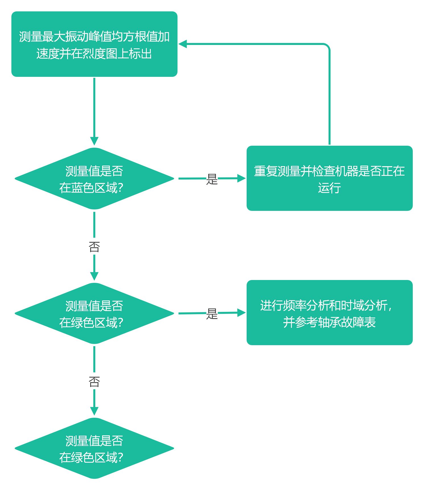 大多数滚动接触面严重损坏 | 轴承退化阶段4 | 宽带测量最好消除外部噪声 | 信号变得完全随机,等级增加超过20 dB(即10倍) | 非常高 | 轴承破裂前轴承故障最后阶段 。必须更换轴承 |
