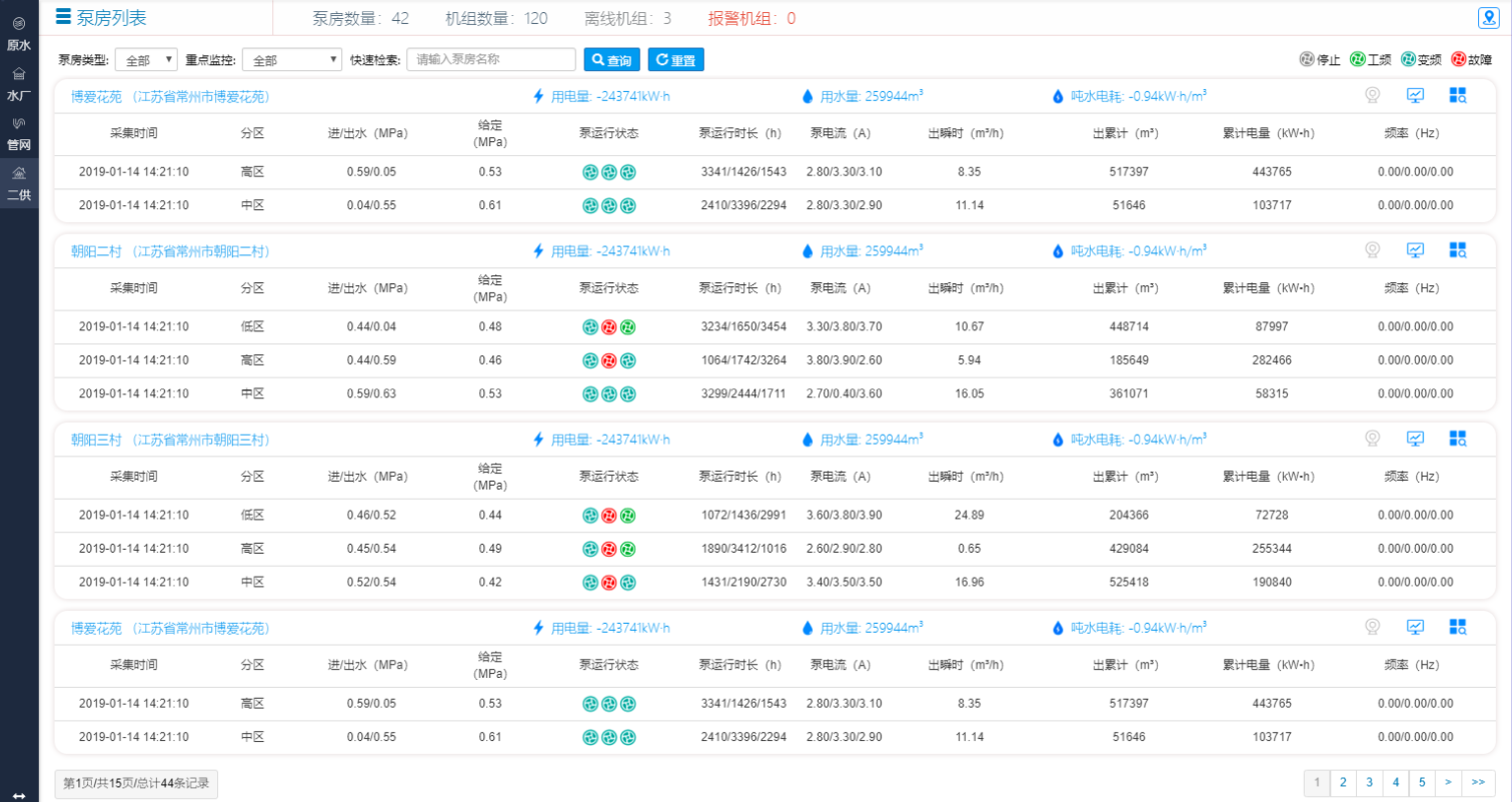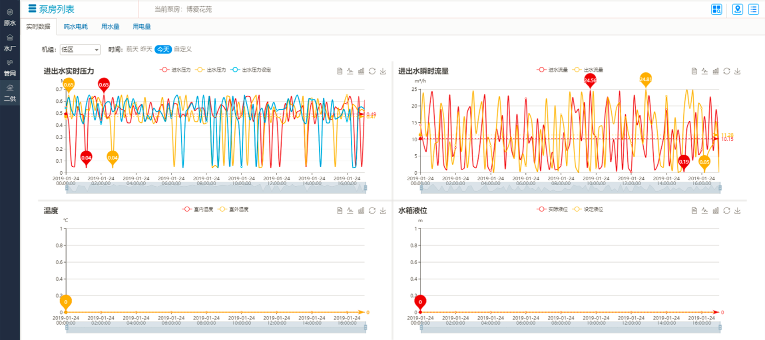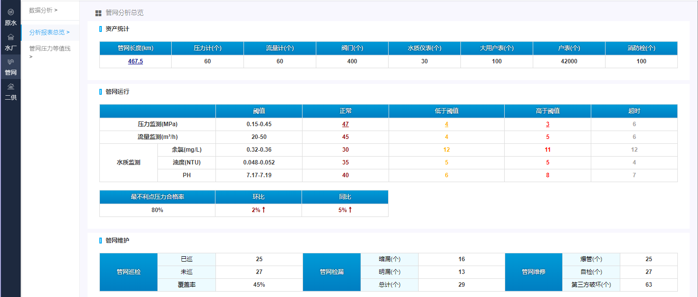 - 运行统计---统计压力、水位、保供时长、浊度、流速等数据;