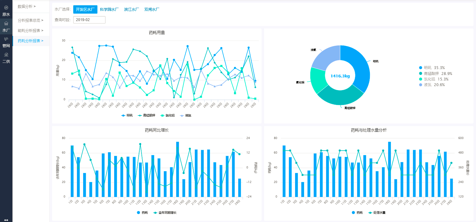 - 药耗统计---统计明矾、高锰酸钾、氯化铝、液氯等药耗数据统计,并对这些数据同比、环比分析;
